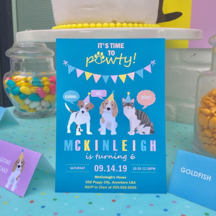 First, you'll need to invite your guests! We've got a super cute Personalized Puppy and Kitty Cat Party Invitation featuring three of our paw-ty animals.
